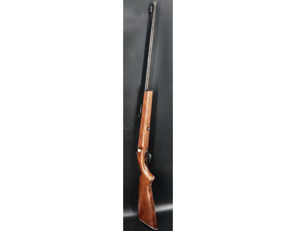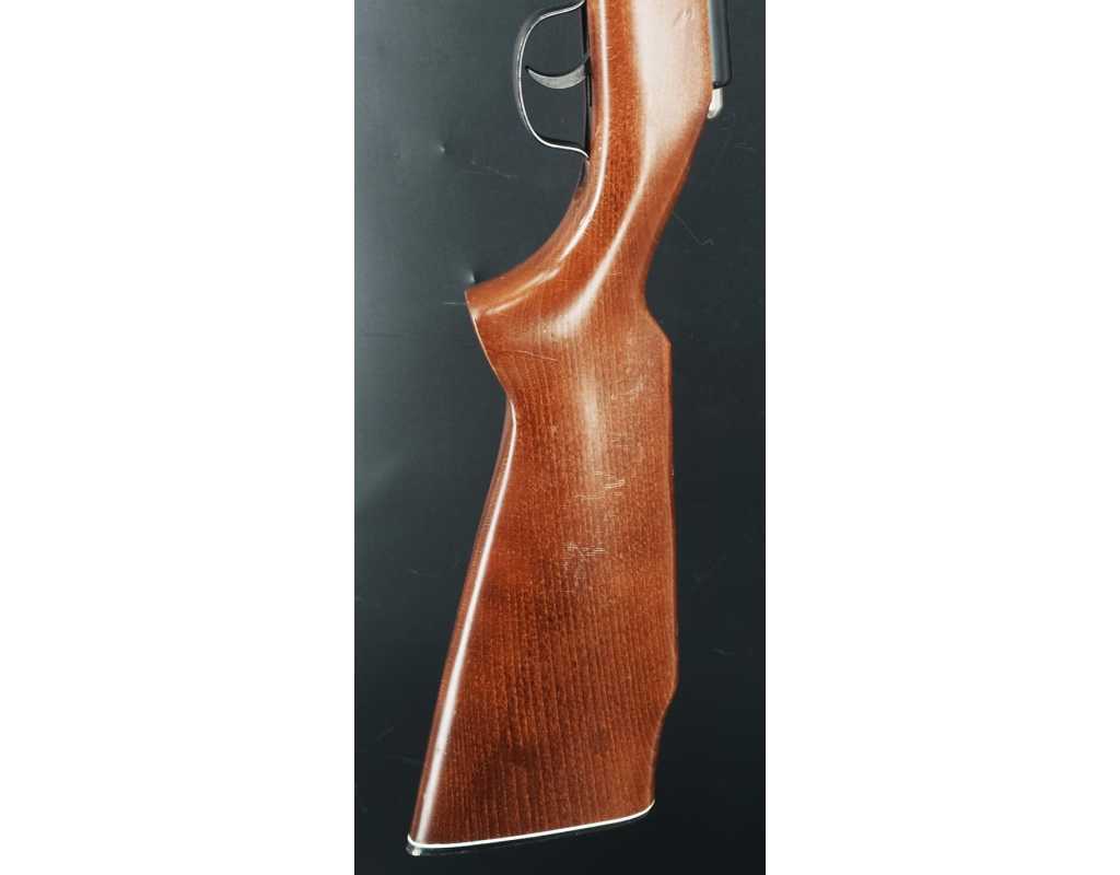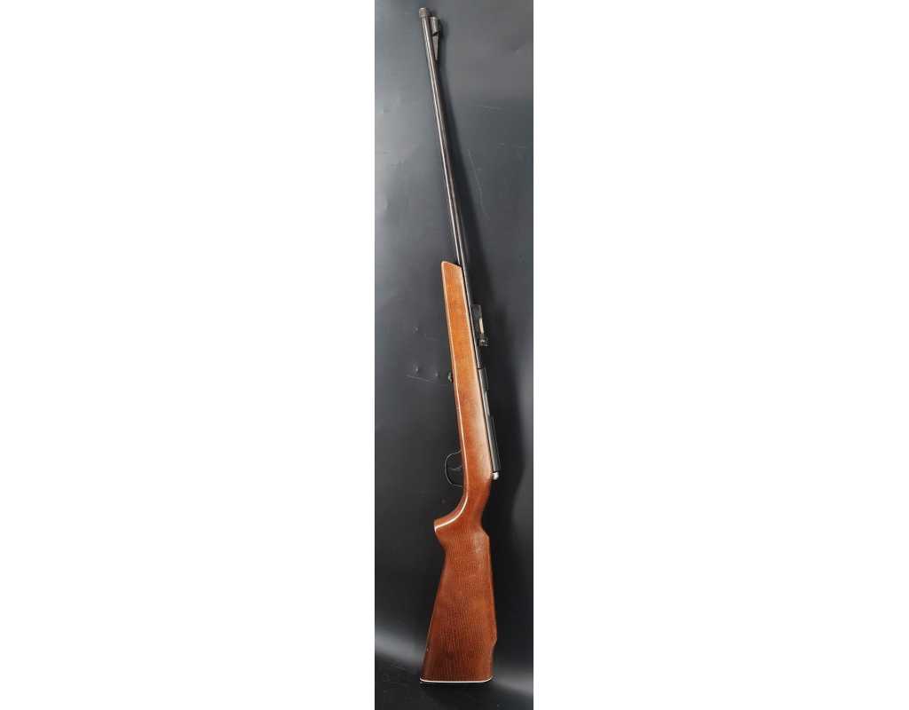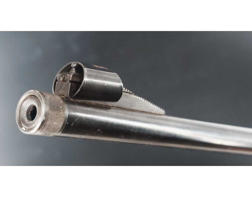 carabine Gaucher mono coup calibre 22LR. Bronzage d'origine sans tache, crosse 35cm en noyer sans accident, rayures miroir et mécanisme sans usure, bouchon fileté à la bouche pour modérateur de son. Canon 55cm, longueur totale 101cm