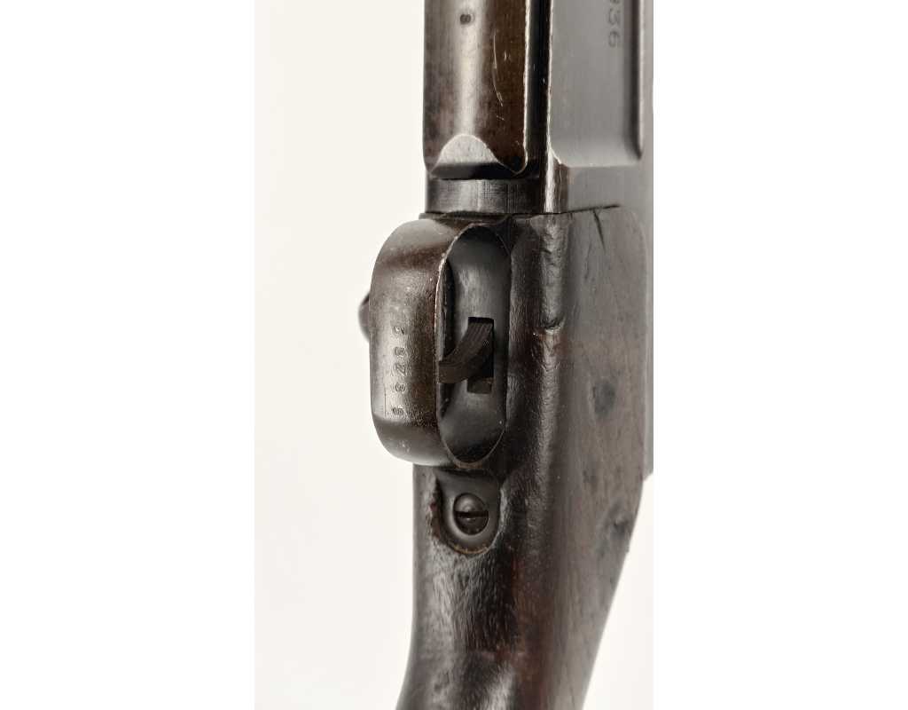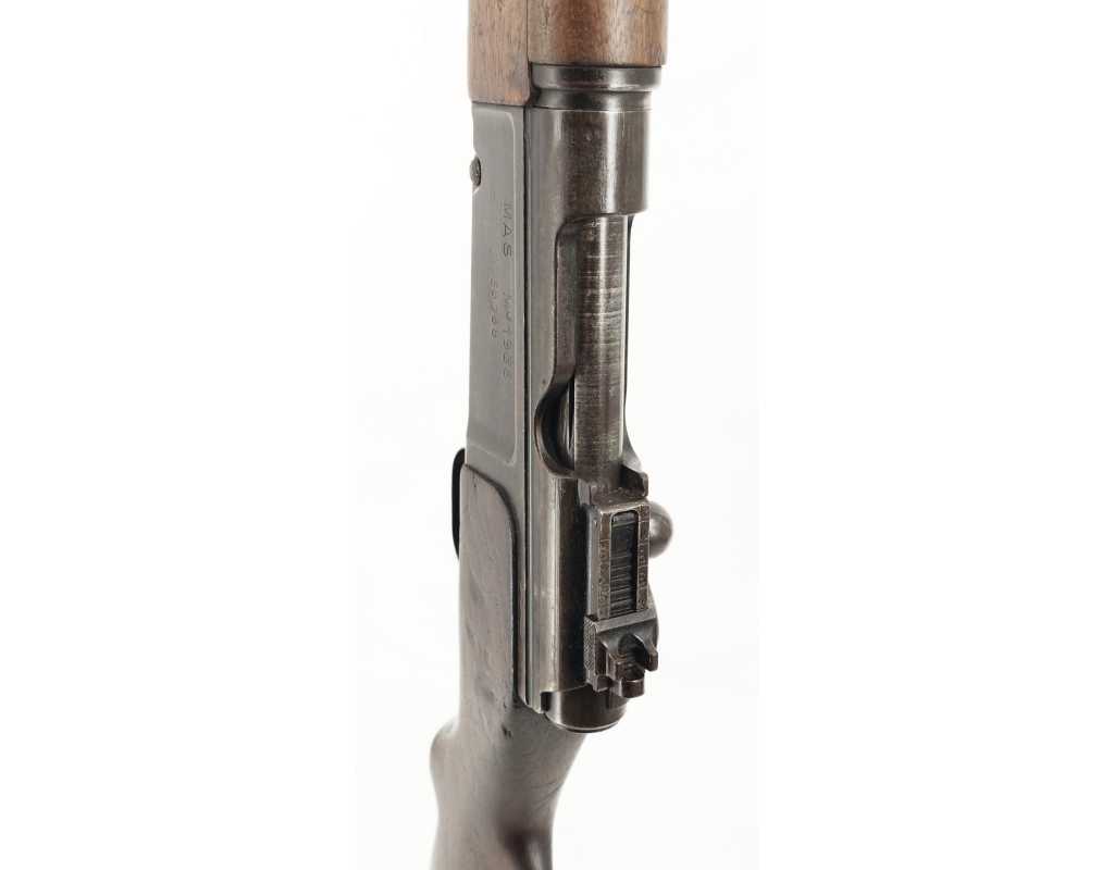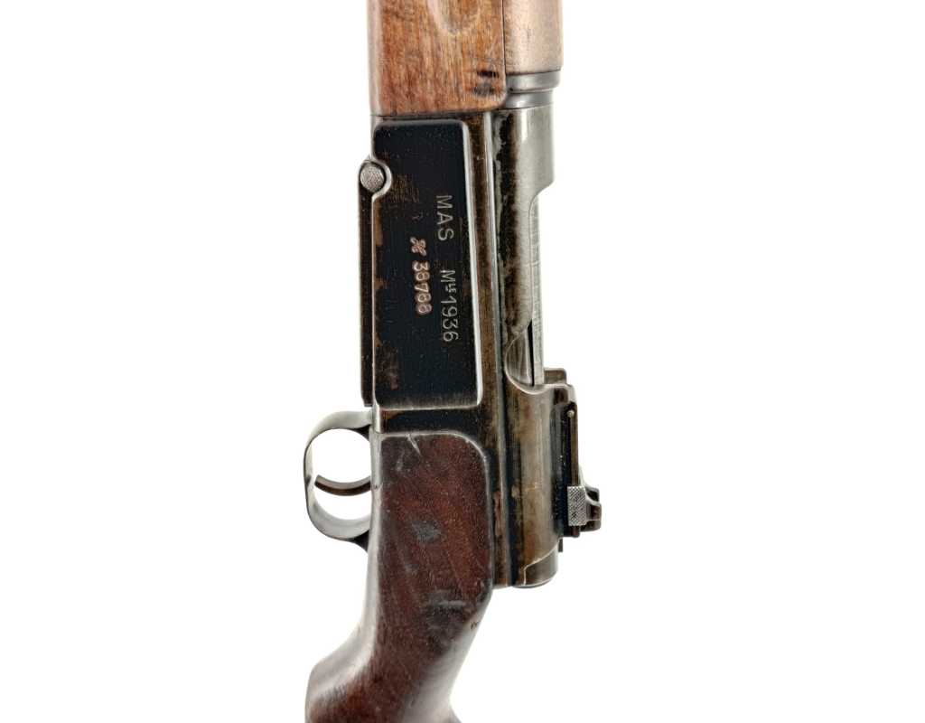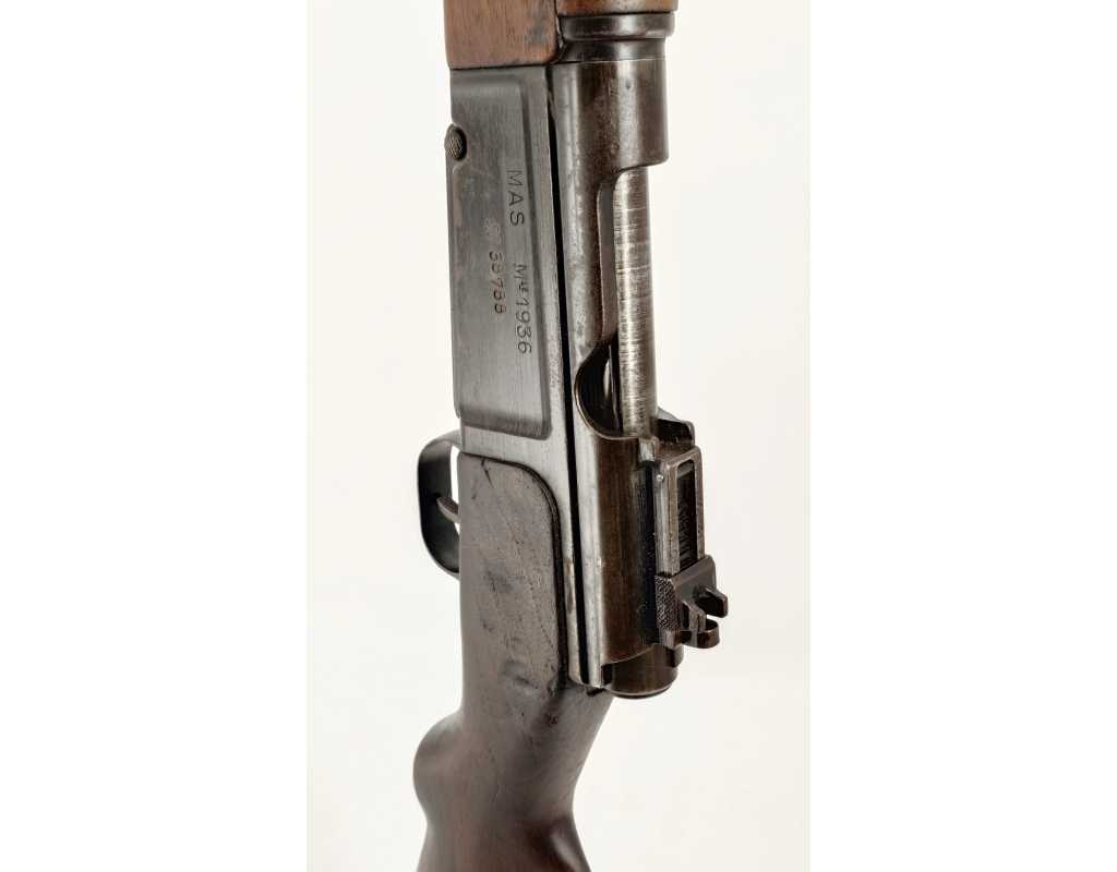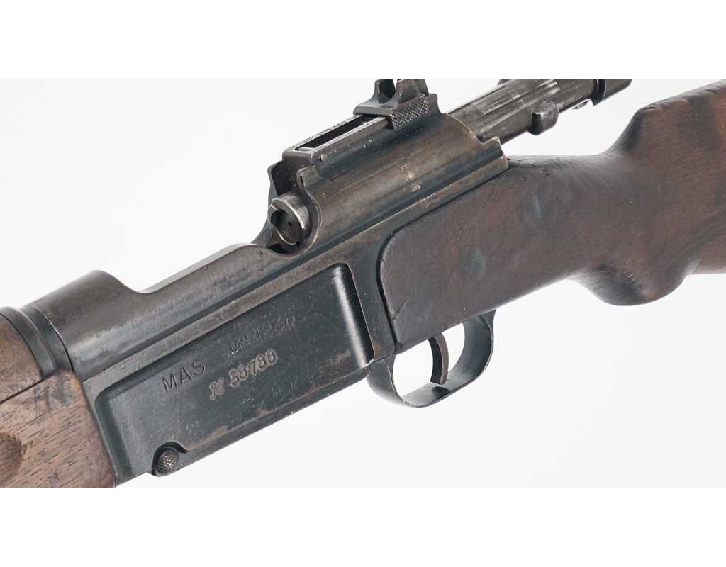 Fusil infanterie MAS modèle 36 1er type St Etienne de 1940 numéroté H38788, calibre d'origine 7,5X54 MAS. Peinture noir cuite au four d'origine (usures et taches), toutes pièces d'origine au même numéro excepté la baïonnette. Fins tache d'oxydation localisées. Canon d'origine à rayures d'aspect brillante sans usure particulière ni tache.