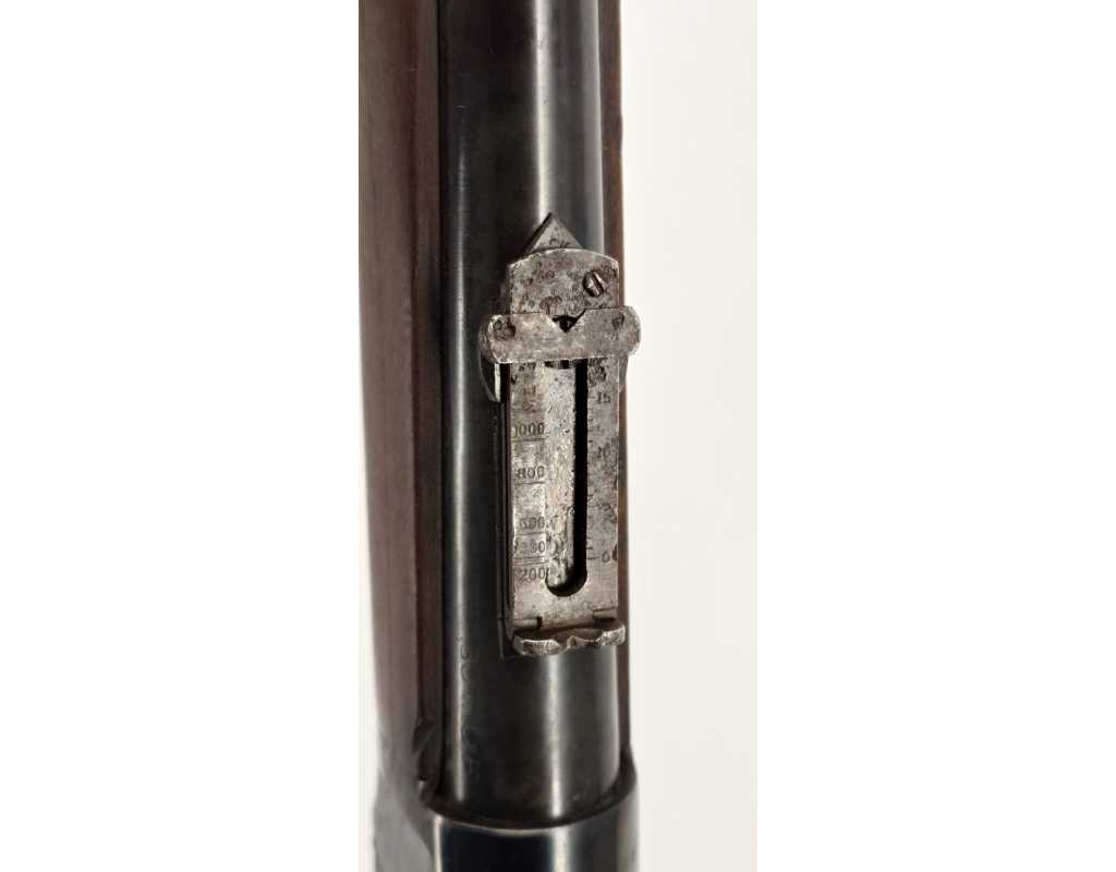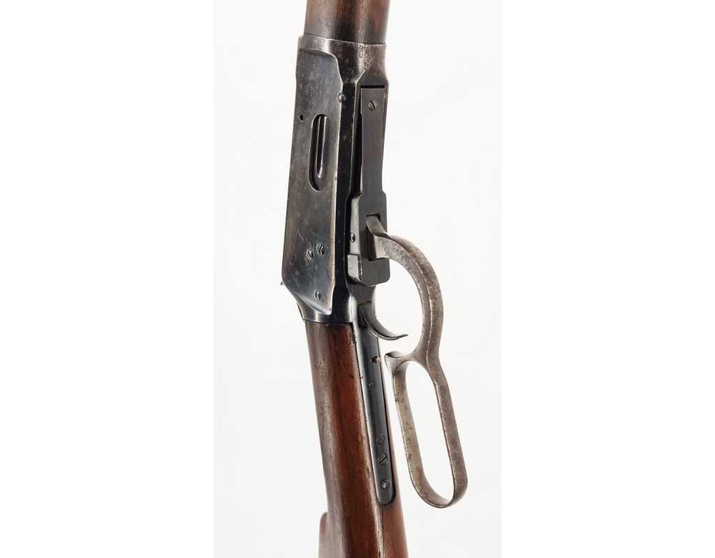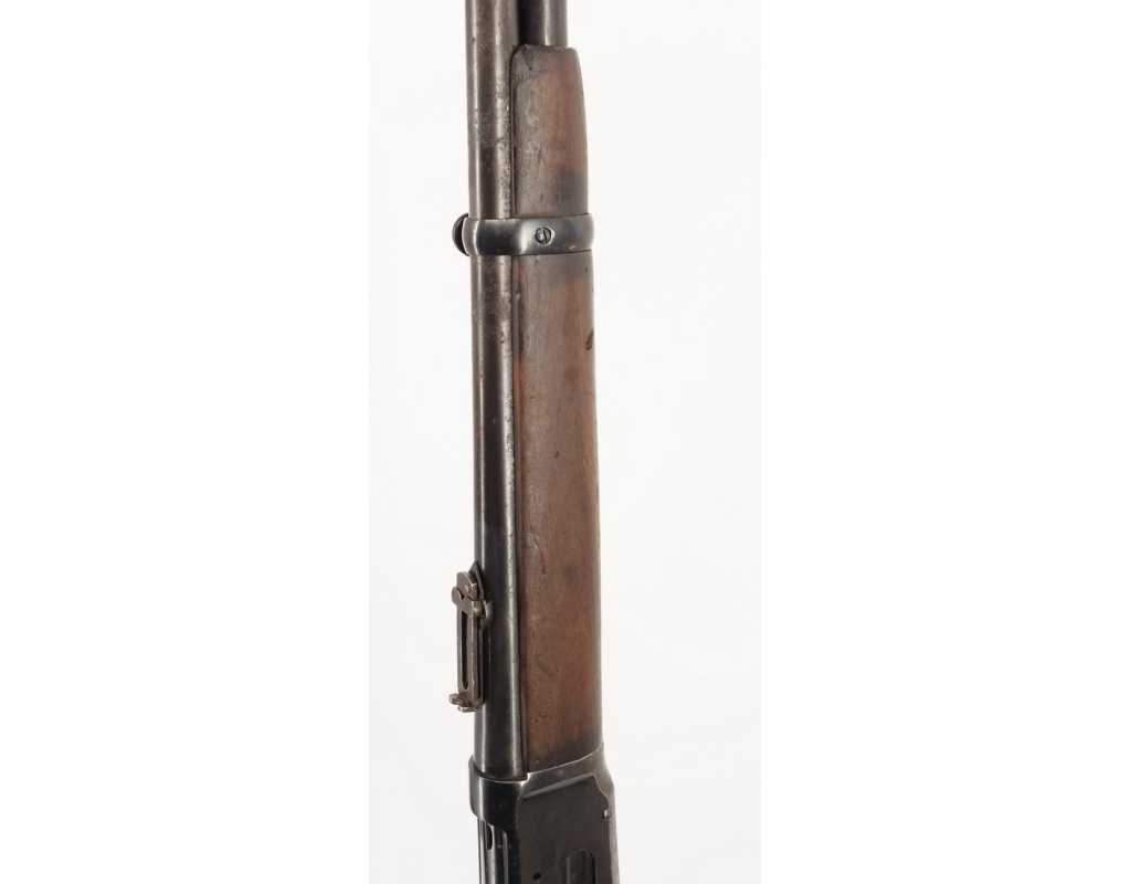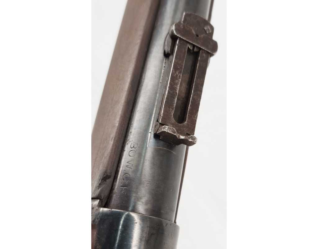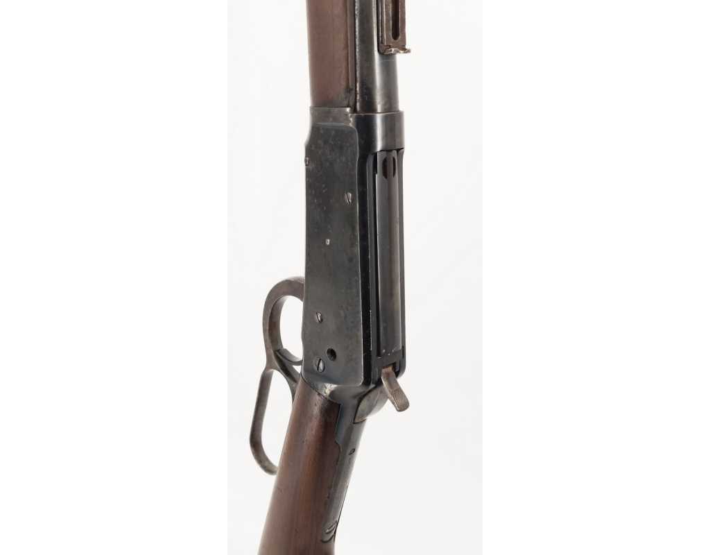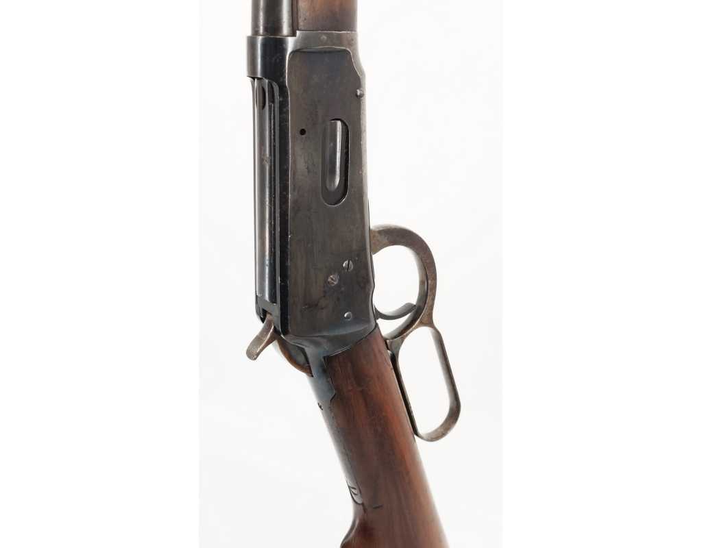 Peu courante Carabine Winchester Armée Française commandée à environ 10 000 exemplaires en 1914 face à la demande d'armement militaire léger pour le premier conflit mondiale, N°664515. Bronzage d'origine bleuté sur le boitier, garnitures et tube magasin avec fines taches d'oxydation localisées, canon recolloré avec disparition des marquages hormis l'indication du calibre, queu de culasse bien marquée du modèle 1894 et du fabricant Winchester. Canon long de 51cm, rayures d'aspect brillantes satinées sans usure particulière, légère rugosité sans corrosion. Crosse et garde main en noyer en excellent état, petites traces de manipulation sans accident hormis un léger éclat devant le talon. Hausse d'origine graduée en mètres, passant de bretelle sur la grenadière et la crosse caractéristique du modèle bien poinçonné d'un "M". Arme en bel état de conservation avec conservation du jaspage sur le chien, en partie sur le levier d'armement, manque l'anneau de selle sur le boitier qui n'avait pas d'utilité dans l'aviation militaire française, hausse repositionnée sur queue d'aronde suite à son remplacement ultérieur par un autre modèle à la queue d'aronde plus longue, léger fêle au garde main devant l'attache de l'anneau de grenadière.
