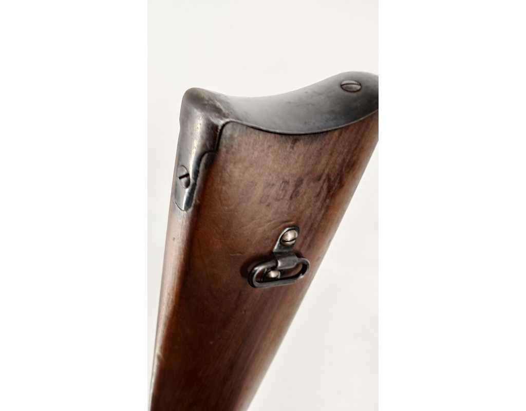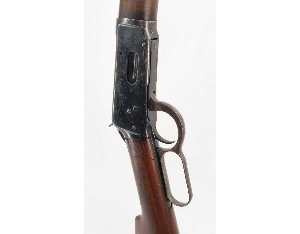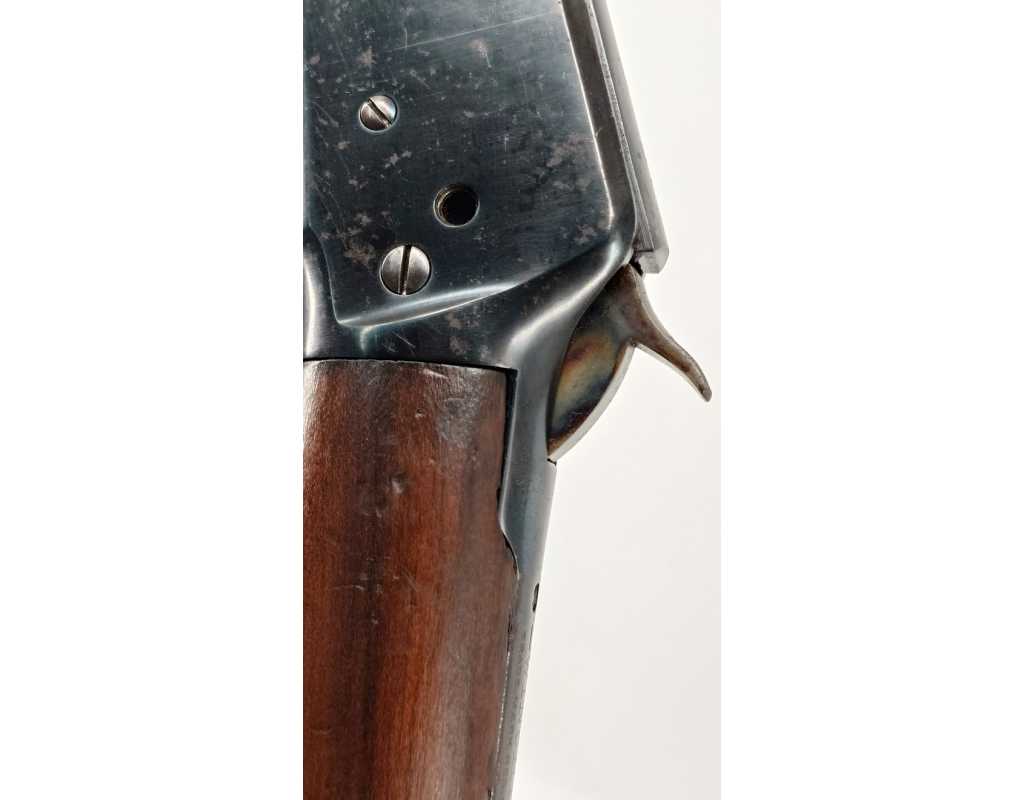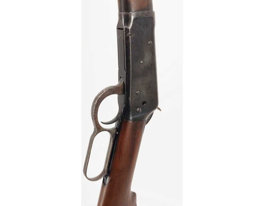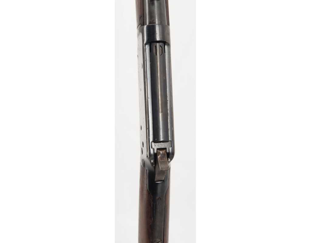 Peu courante Carabine Winchester Armée Française commandée à environ 10 000 exemplaires en 1914 face à la demande d'armement militaire léger pour le premier conflit mondiale, N°664515. Bronzage d'origine bleuté sur le boitier, garnitures et tube magasin avec fines taches d'oxydation localisées, canon recolloré avec disparition des marquages hormis l'indication du calibre, queu de culasse bien marquée du modèle 1894 et du fabricant Winchester. Canon long de 51cm, rayures d'aspect brillantes satinées sans usure particulière, légère rugosité sans corrosion. Crosse et garde main en noyer en excellent état, petites traces de manipulation sans accident hormis un léger éclat devant le talon. Hausse d'origine graduée en mètres, passant de bretelle sur la grenadière et la crosse caractéristique du modèle bien poinçonné d'un "M". Arme en bel état de conservation avec conservation du jaspage sur le chien, en partie sur le levier d'armement, manque l'anneau de selle sur le boitier qui n'avait pas d'utilité dans l'aviation militaire française, hausse repositionnée sur queue d'aronde suite à son remplacement ultérieur par un autre modèle à la queue d'aronde plus longue, léger fêle au garde main devant l'attache de l'anneau de grenadière.