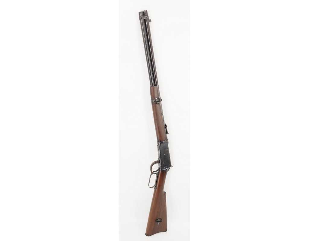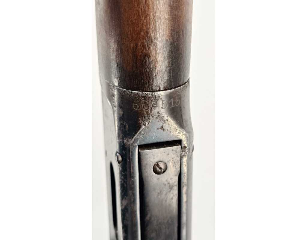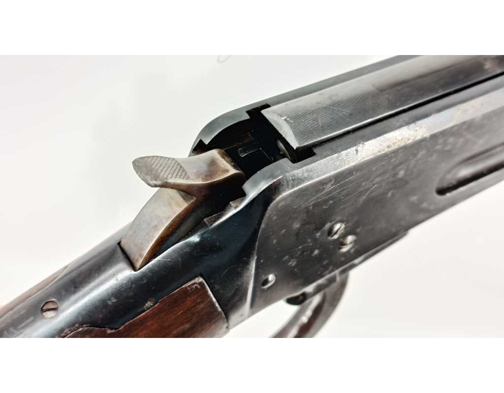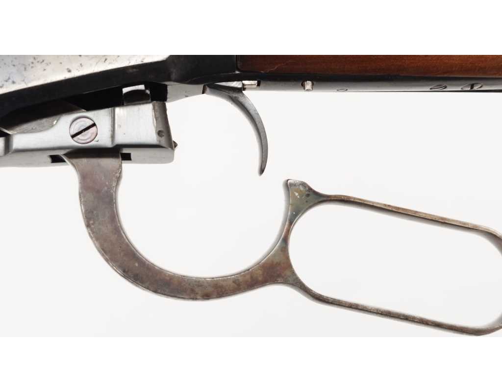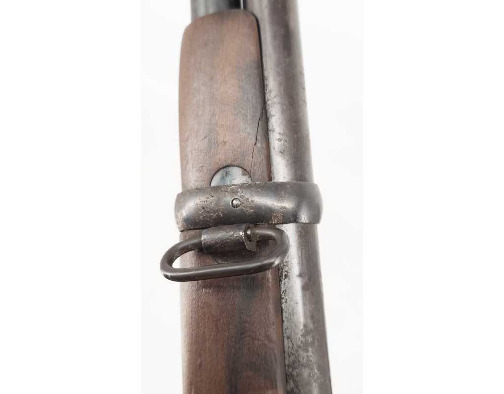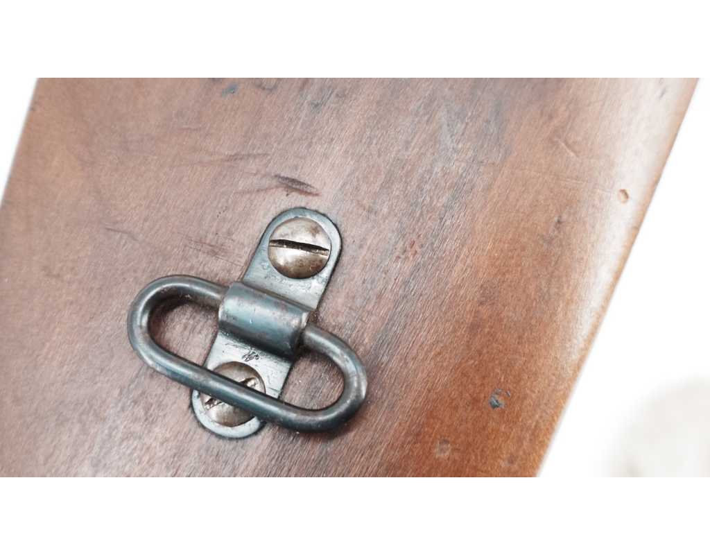 Peu courante Carabine Winchester Armée Française commandée à environ 10 000 exemplaires en 1914 face à la demande d'armement militaire léger pour le premier conflit mondiale, N°664515. Bronzage d'origine bleuté sur le boitier, garnitures et tube magasin avec fines taches d'oxydation localisées, canon recolloré avec disparition des marquages hormis l'indication du calibre, queu de culasse bien marquée du modèle 1894 et du fabricant Winchester. Canon long de 51cm, rayures d'aspect brillantes satinées sans usure particulière, légère rugosité sans corrosion. Crosse et garde main en noyer en excellent état, petites traces de manipulation sans accident hormis un léger éclat devant le talon. Hausse d'origine graduée en mètres, passant de bretelle sur la grenadière et la crosse caractéristique du modèle bien poinçonné d'un "M". Arme en bel état de conservation avec conservation du jaspage sur le chien, en partie sur le levier d'armement, manque l'anneau de selle sur le boitier qui n'avait pas d'utilité dans l'aviation militaire française, hausse repositionnée sur queue d'aronde suite à son remplacement ultérieur par un autre modèle à la queue d'aronde plus longue, léger fêle au garde main devant l'attache de l'anneau de grenadière.