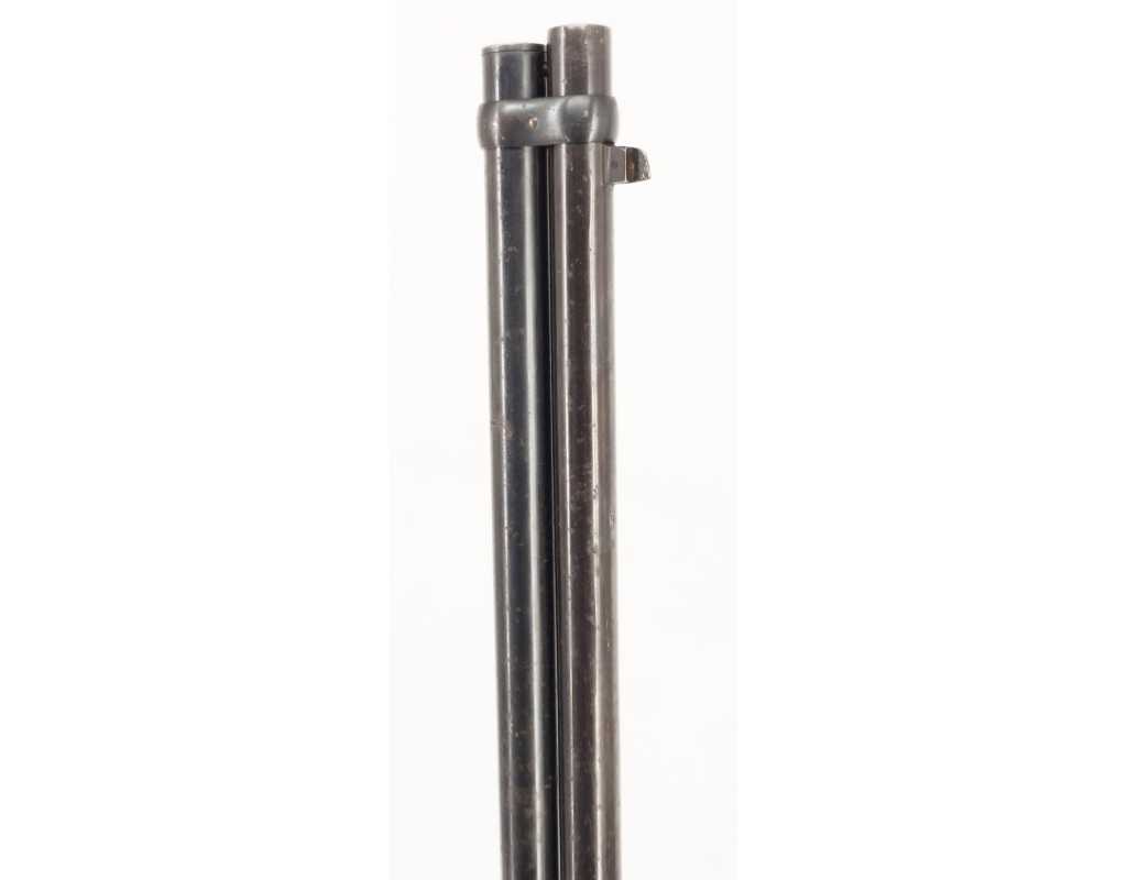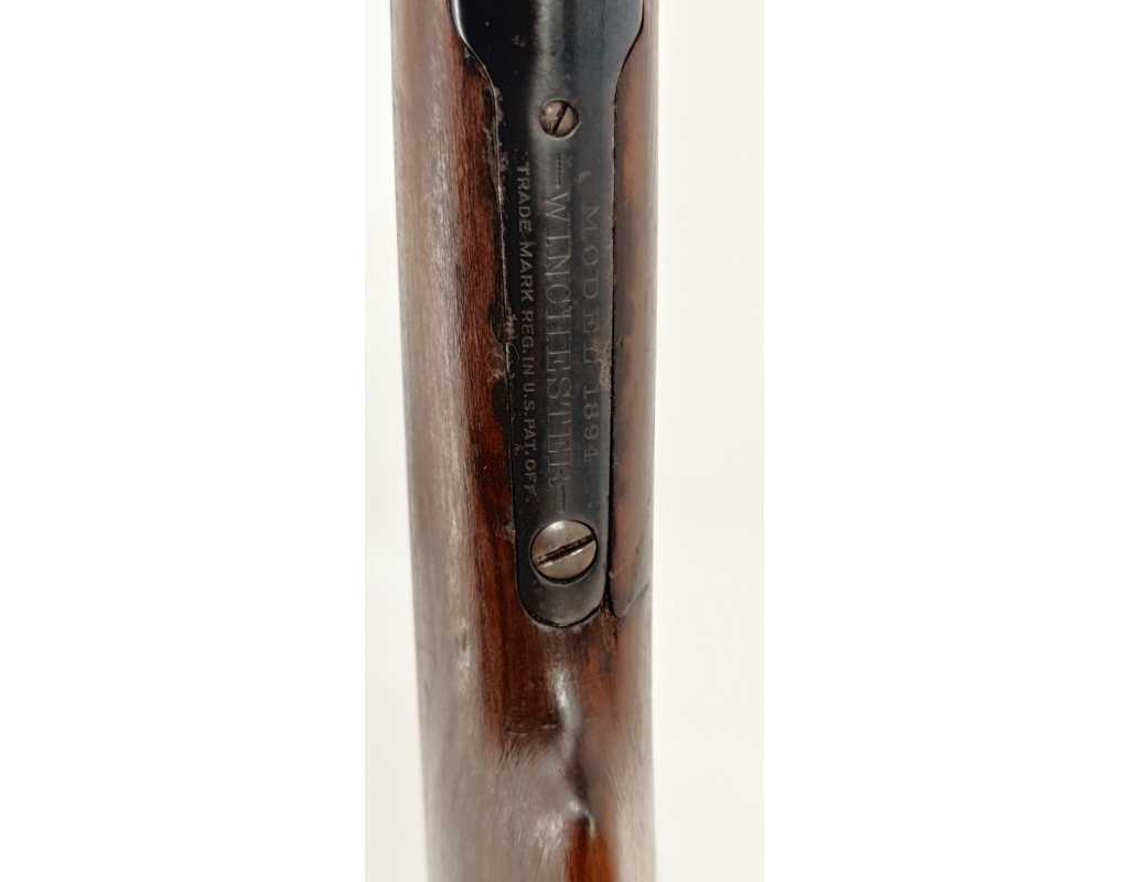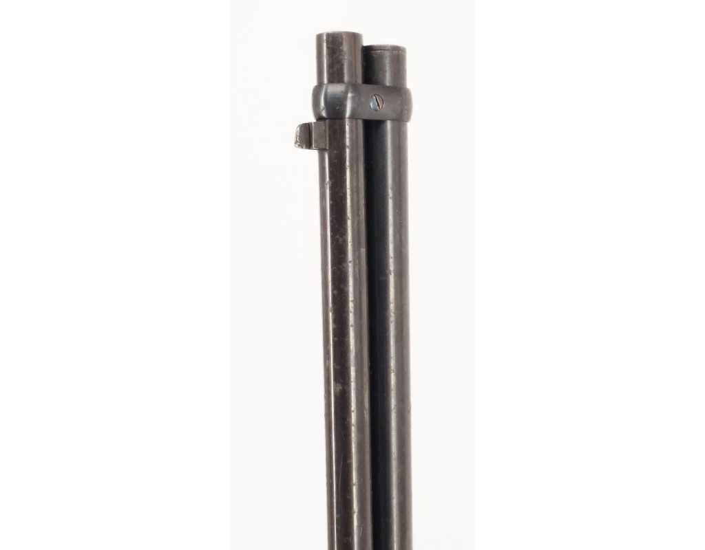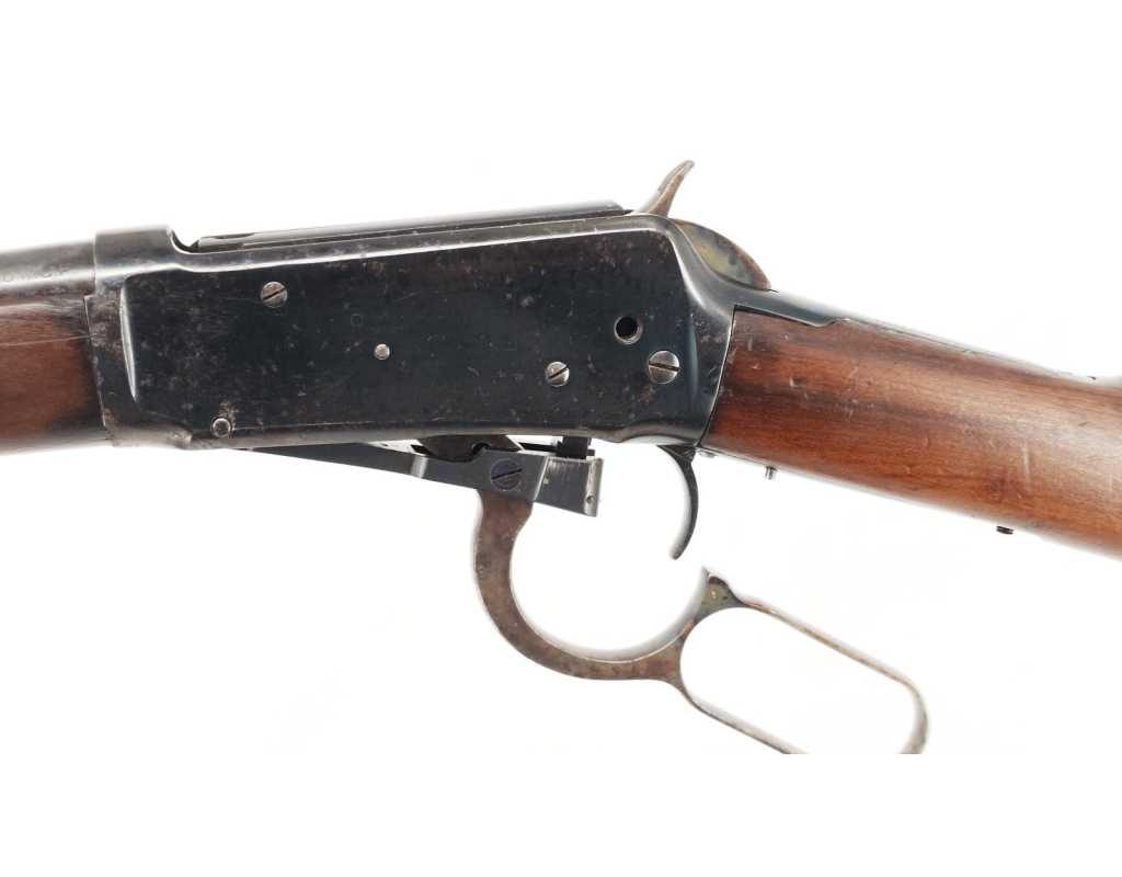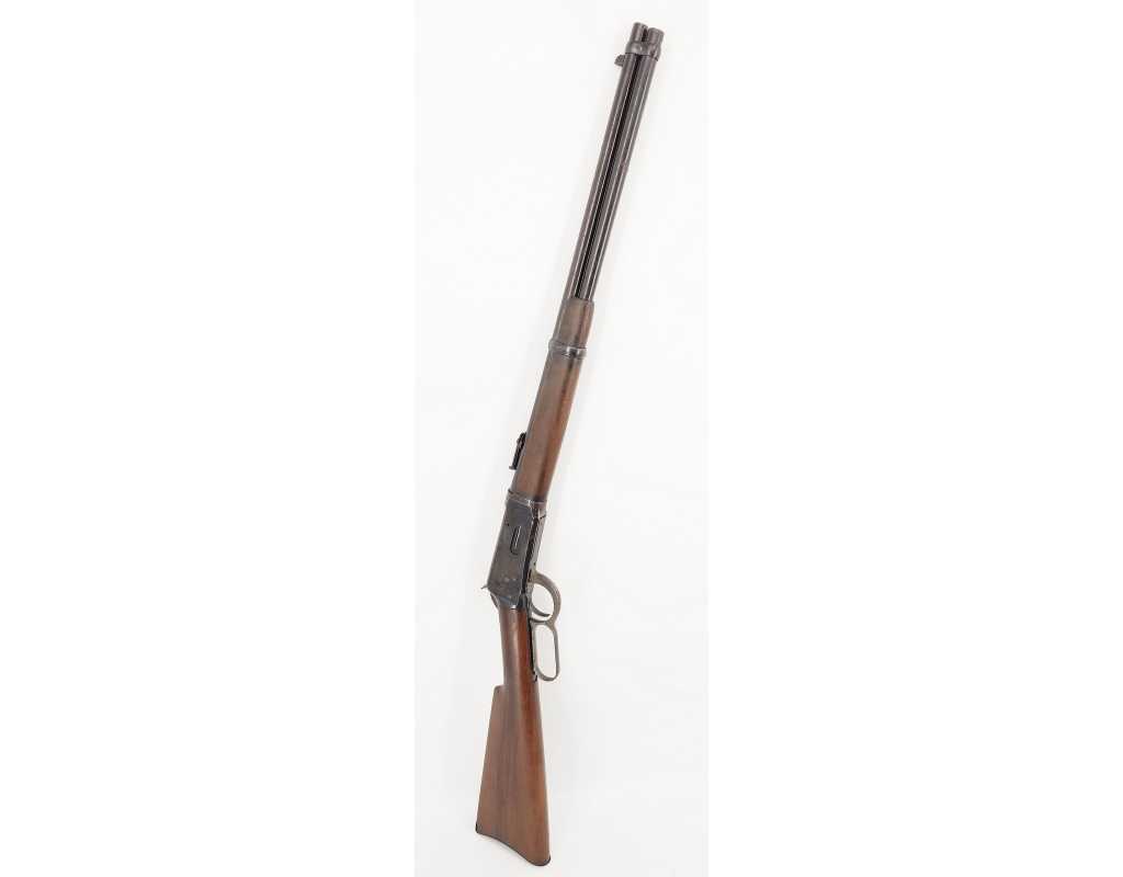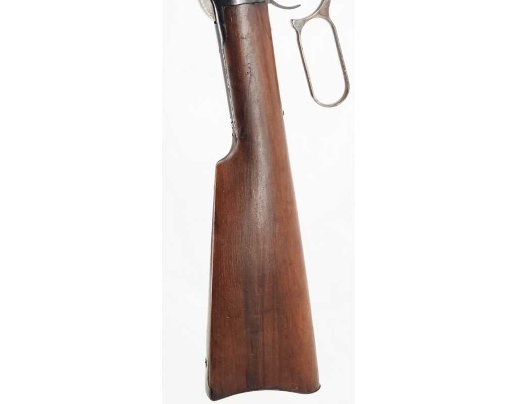 Peu courante Carabine Winchester Armée Française commandée à environ 10 000 exemplaires en 1914 face à la demande d'armement militaire léger pour le premier conflit mondiale, N°664515. Bronzage d'origine bleuté sur le boitier, garnitures et tube magasin avec fines taches d'oxydation localisées, canon recolloré avec disparition des marquages hormis l'indication du calibre, queu de culasse bien marquée du modèle 1894 et du fabricant Winchester. Canon long de 51cm, rayures d'aspect brillantes satinées sans usure particulière, légère rugosité sans corrosion. Crosse et garde main en noyer en excellent état, petites traces de manipulation sans accident hormis un léger éclat devant le talon. Hausse d'origine graduée en mètres, passant de bretelle sur la grenadière et la crosse caractéristique du modèle bien poinçonné d'un "M". Arme en bel état de conservation avec conservation du jaspage sur le chien, en partie sur le levier d'armement, manque l'anneau de selle sur le boitier qui n'avait pas d'utilité dans l'aviation militaire française, hausse repositionnée sur queue d'aronde suite à son remplacement ultérieur par un autre modèle à la queue d'aronde plus longue, léger fêle au garde main devant l'attache de l'anneau de grenadière.
