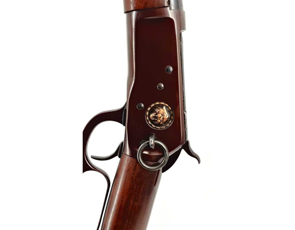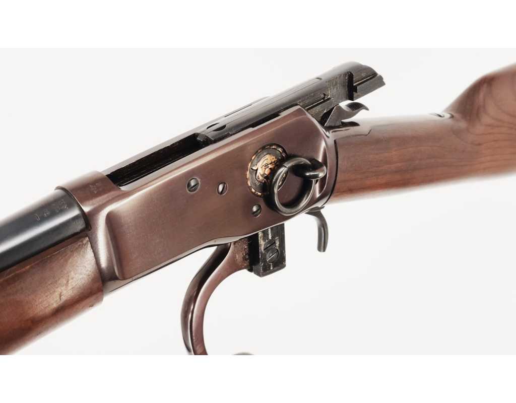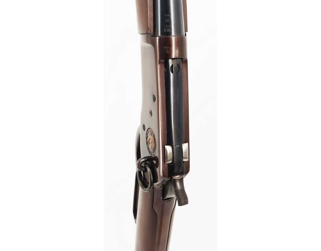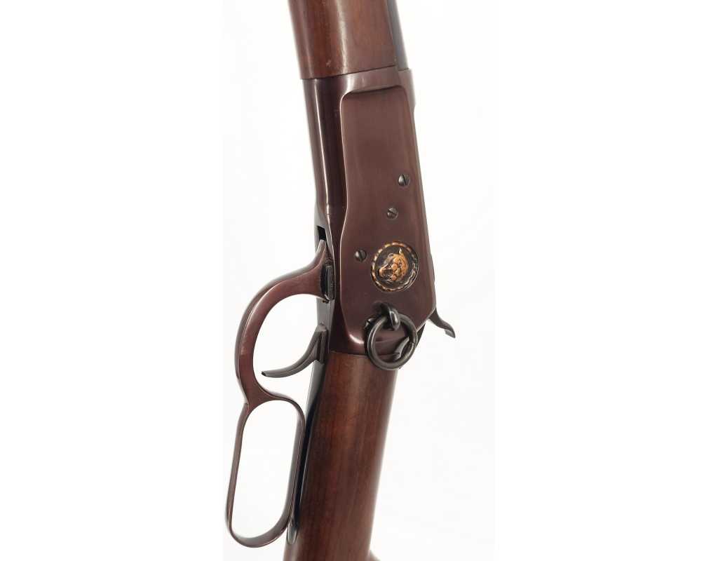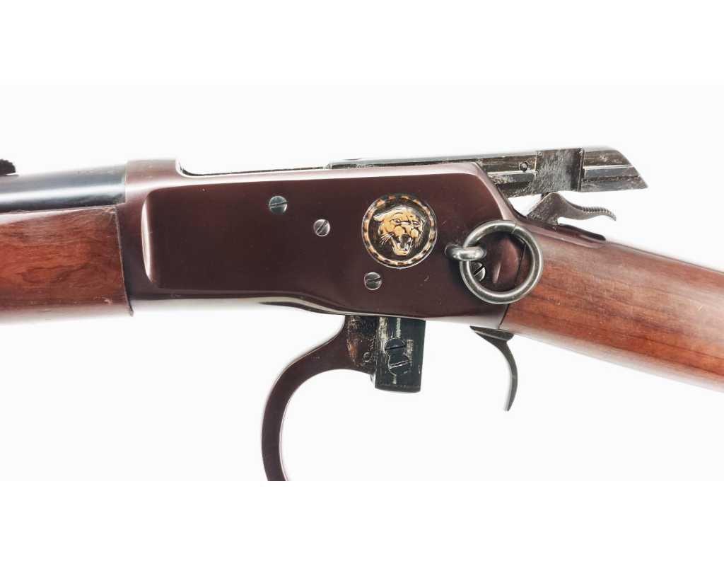 Carabine à levier sous garde Type winchester produite au Brézil par Rossi, modèle 92 PUMA avec logo incrusté en série limité. Fiition d'origine bronzée, couleur parme sur le boitier de part son traitement thermique, noir sur le canon et garnitures. Calibre 44 Remington Magnum, canon de 51cm rayures brillantes miroir sans usure particulière ni tache. Monture en noyer sans accident.