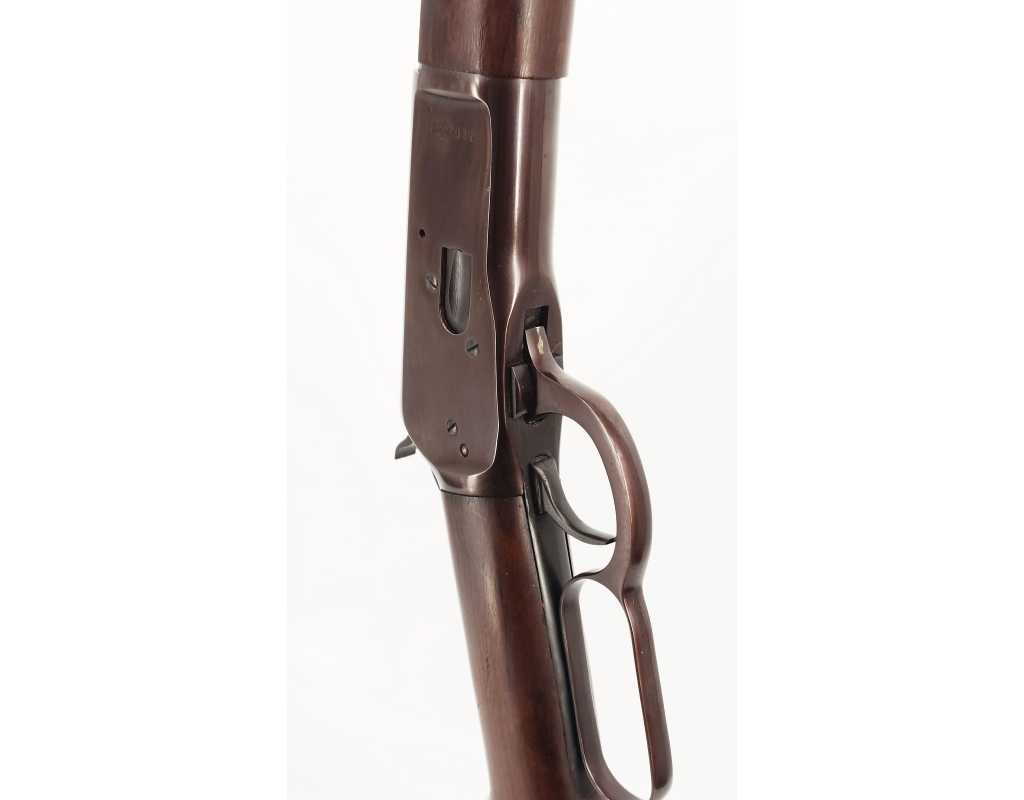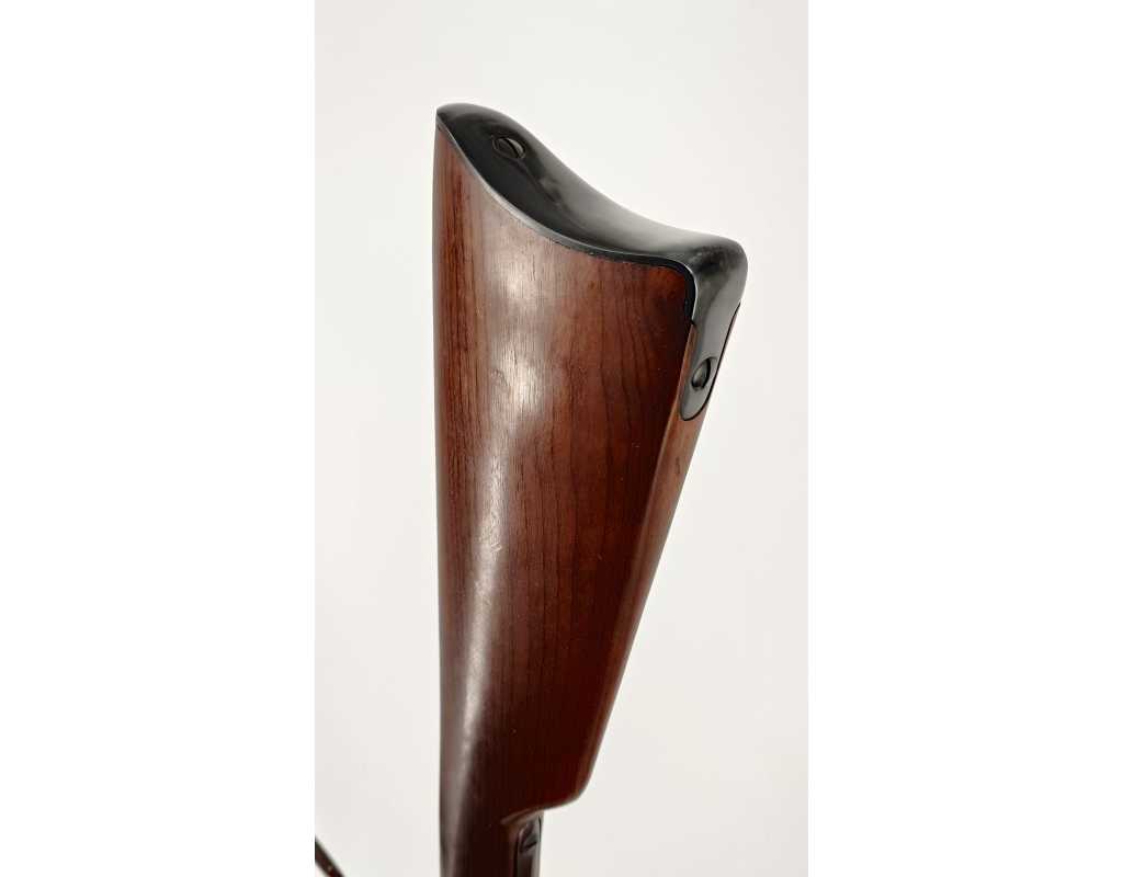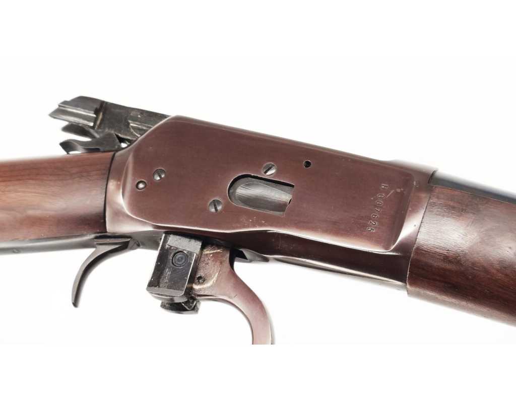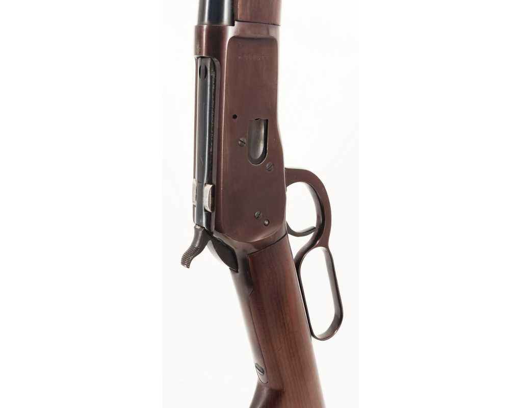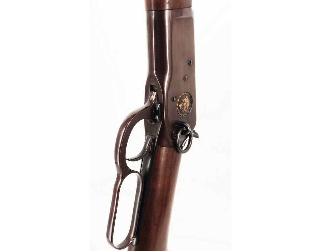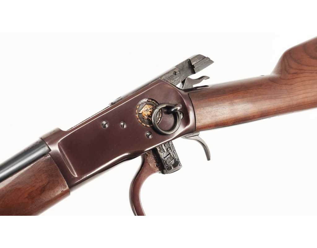 Carabine à levier sous garde Type winchester produite au Brézil par Rossi, modèle 92 PUMA avec logo incrusté en série limité. Fiition d'origine bronzée, couleur parme sur le boitier de part son traitement thermique, noir sur le canon et garnitures. Calibre 44 Remington Magnum, canon de 51cm rayures brillantes miroir sans usure particulière ni tache. Monture en noyer sans accident.