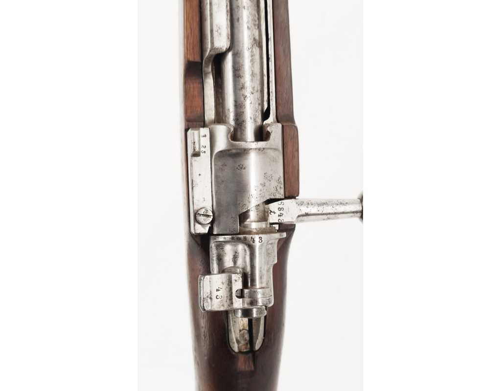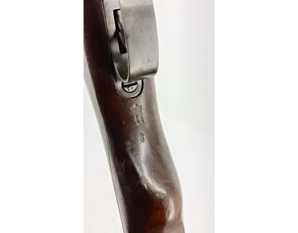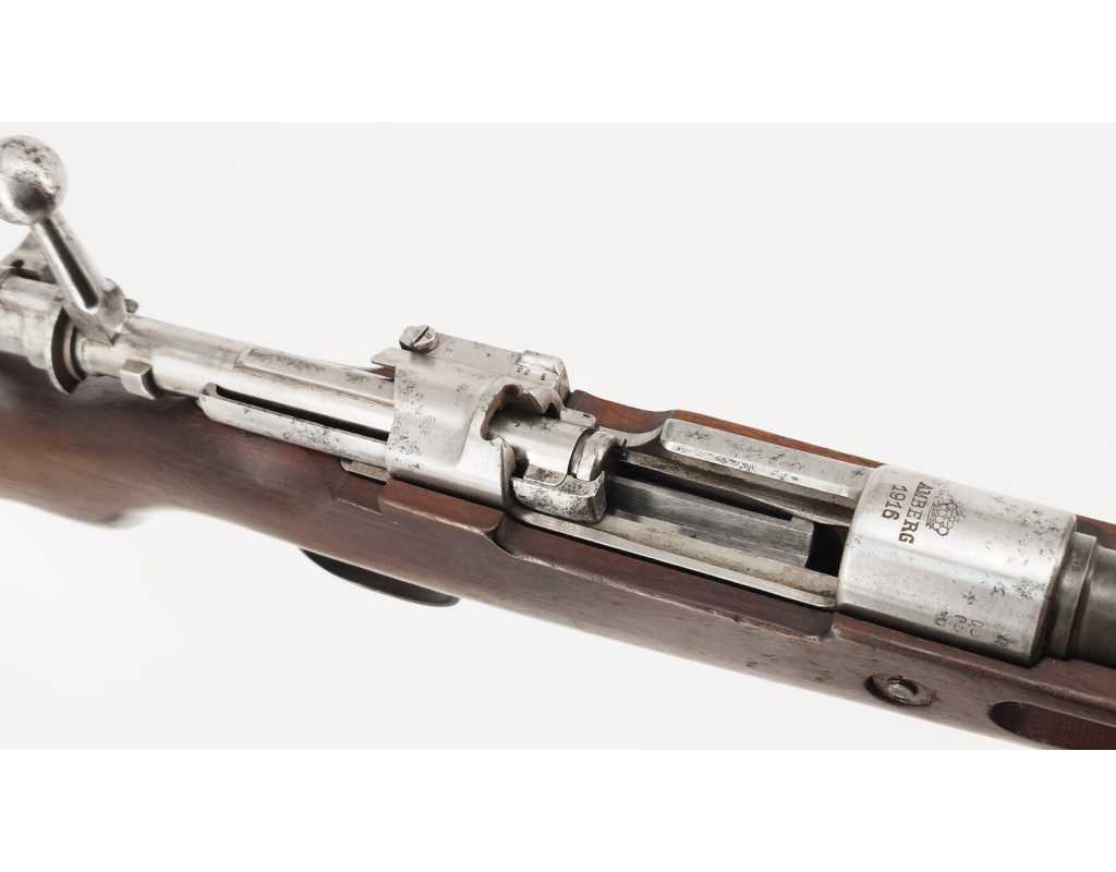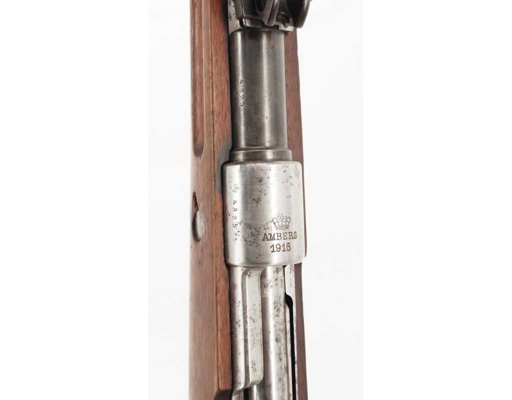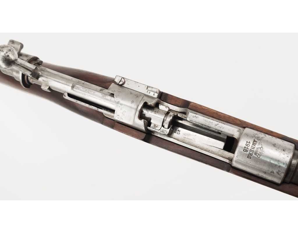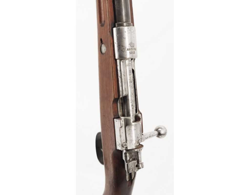 Fusil Mauser Gewehr G 98 Amberg 1916, calibre d'origine 8x57JS par le banc d'épreuve de St Étienne, capacité 5 coups à répétition manuelle. Arme avec toutes pièces d'origine au même numéro excepté la culasse. Bronzage patiné et légèrement taché, marquages de réception et poinçons de conformité sur chaque pièces non atténués. Canon de 750mm à rayures d'aspect satinées sans usure prononcées, fines taches en creux. Crosse et garde main en noyer avec poinçons bien visibles, craquelure du noyer au centre de la crosse côté droit sans fragilité et traces d'usage de manipulation.