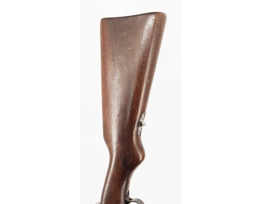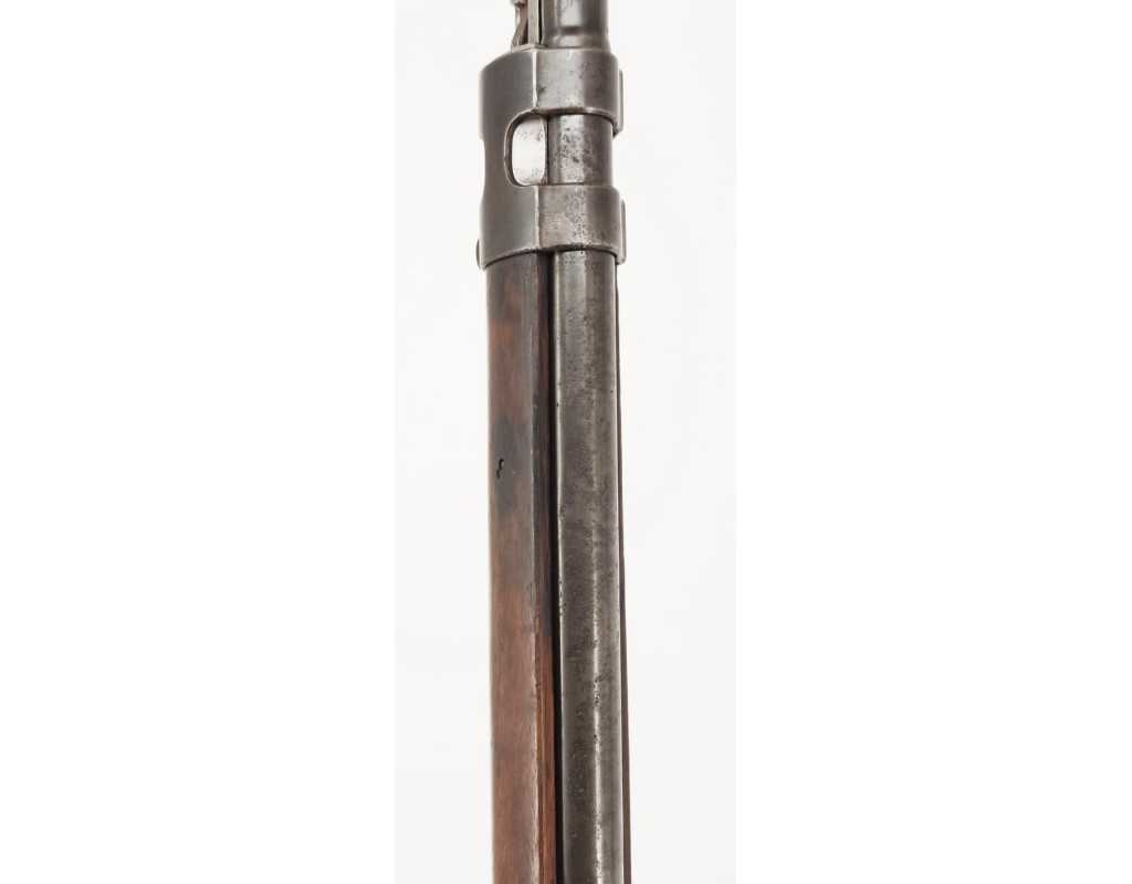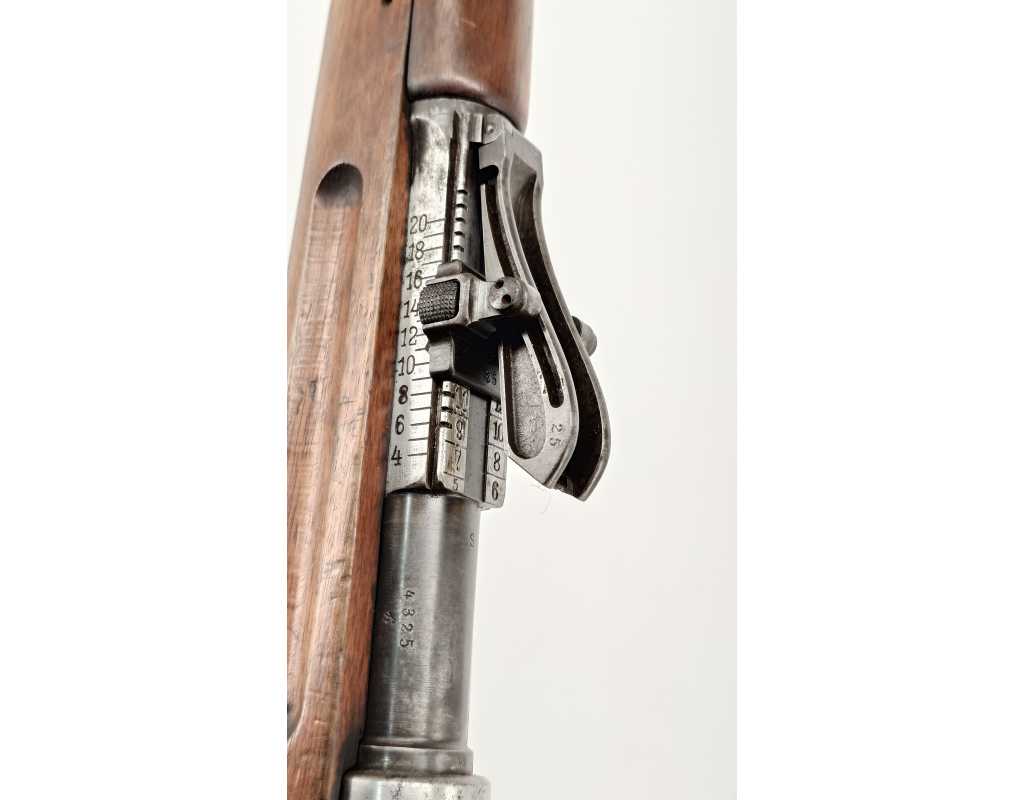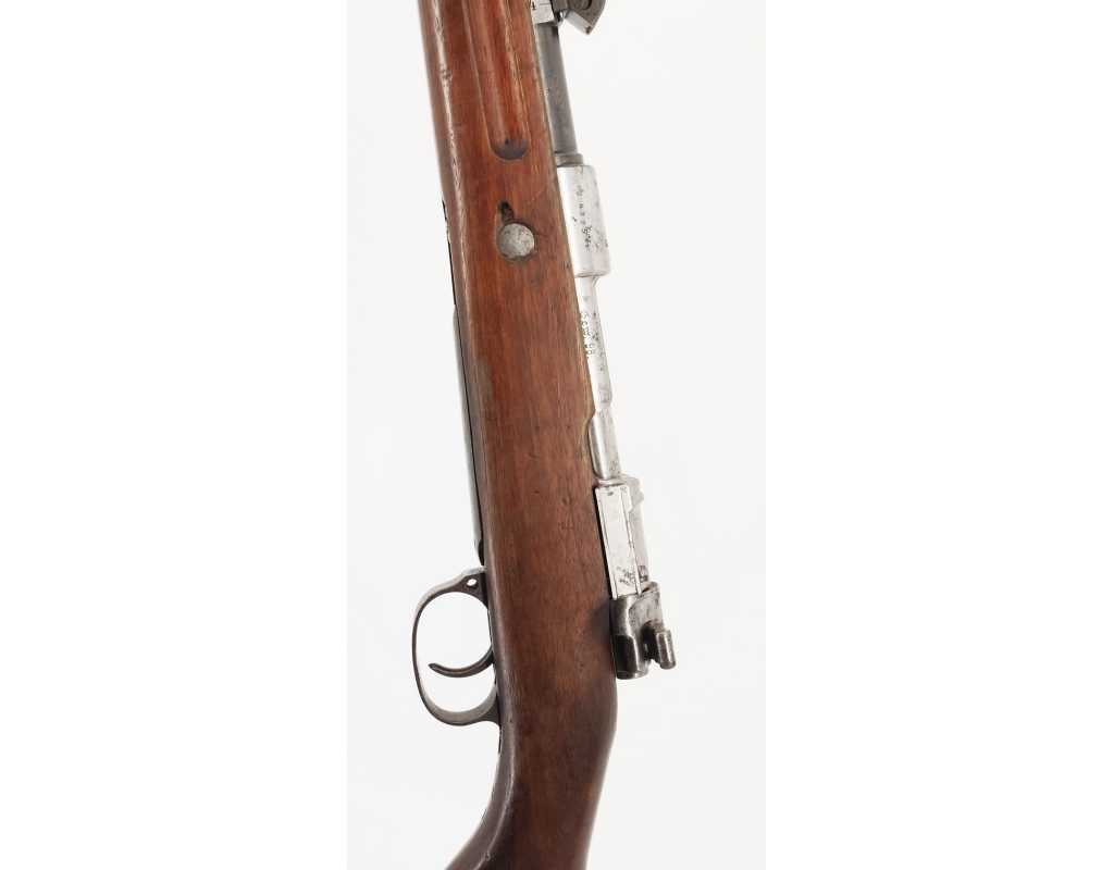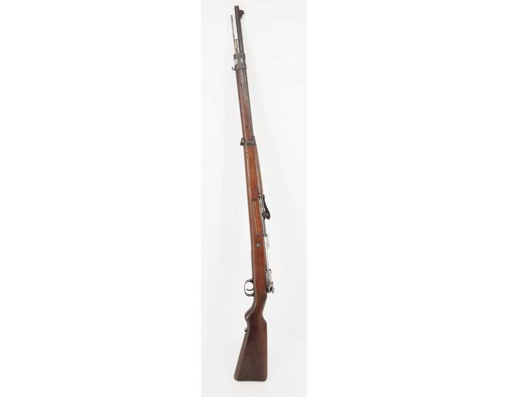 Fusil Mauser Gewehr G 98 Amberg 1916, calibre d'origine 8x57JS par le banc d'épreuve de St Étienne, capacité 5 coups à répétition manuelle. Arme avec toutes pièces d'origine au même numéro excepté la culasse. Bronzage patiné et légèrement taché, marquages de réception et poinçons de conformité sur chaque pièces non atténués. Canon de 750mm à rayures d'aspect satinées sans usure prononcées, fines taches en creux. Crosse et garde main en noyer avec poinçons bien visibles, craquelure du noyer au centre de la crosse côté droit sans fragilité et traces d'usage de manipulation.