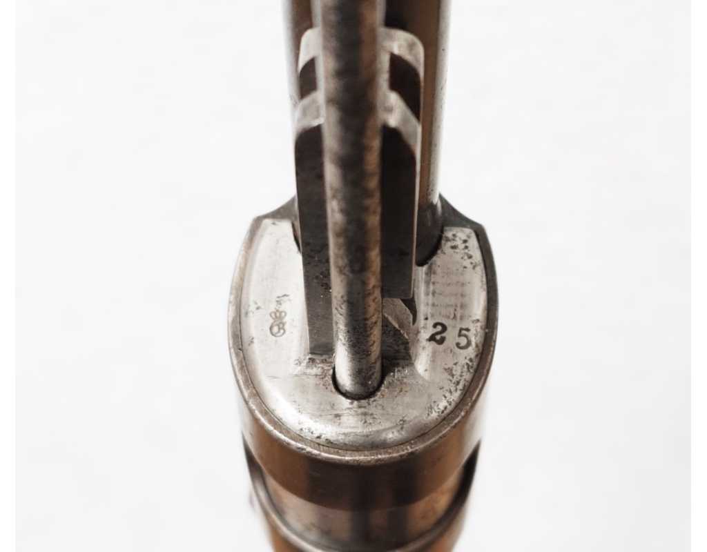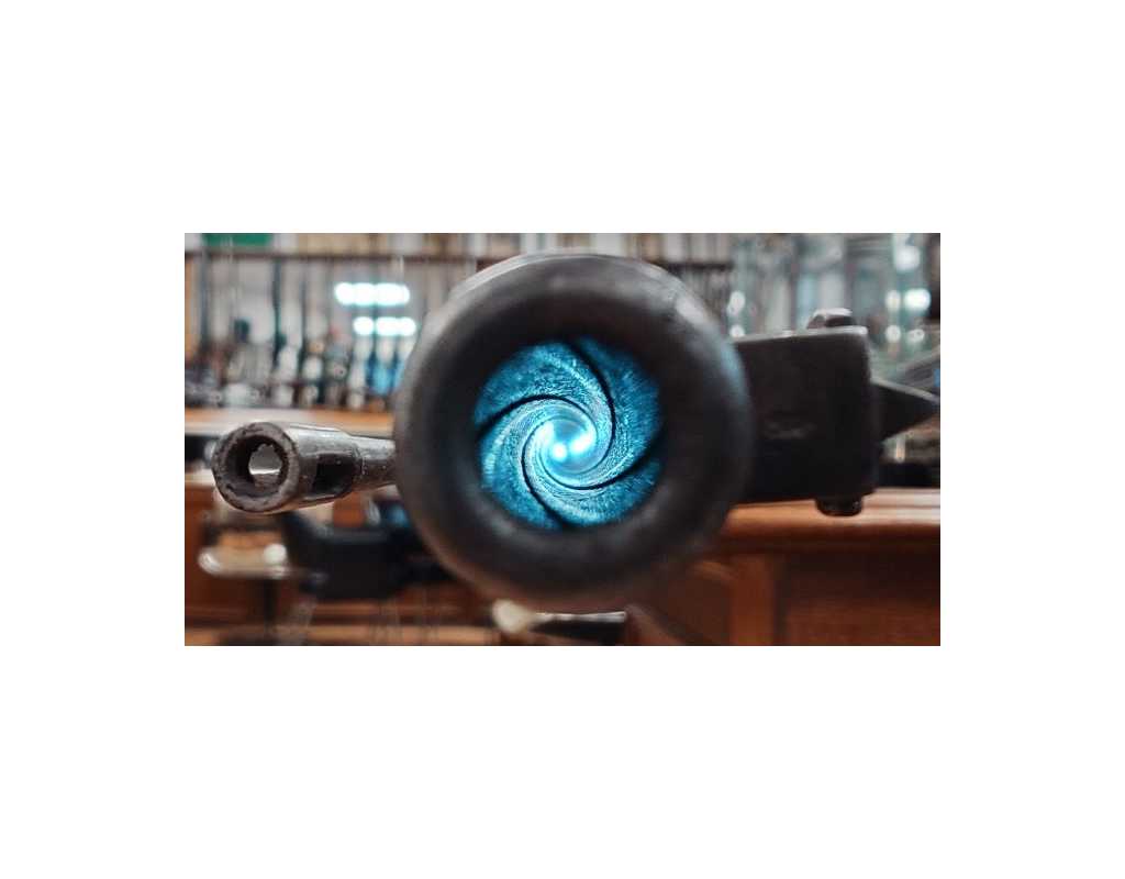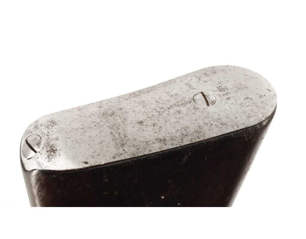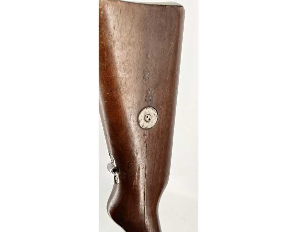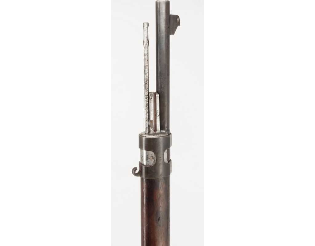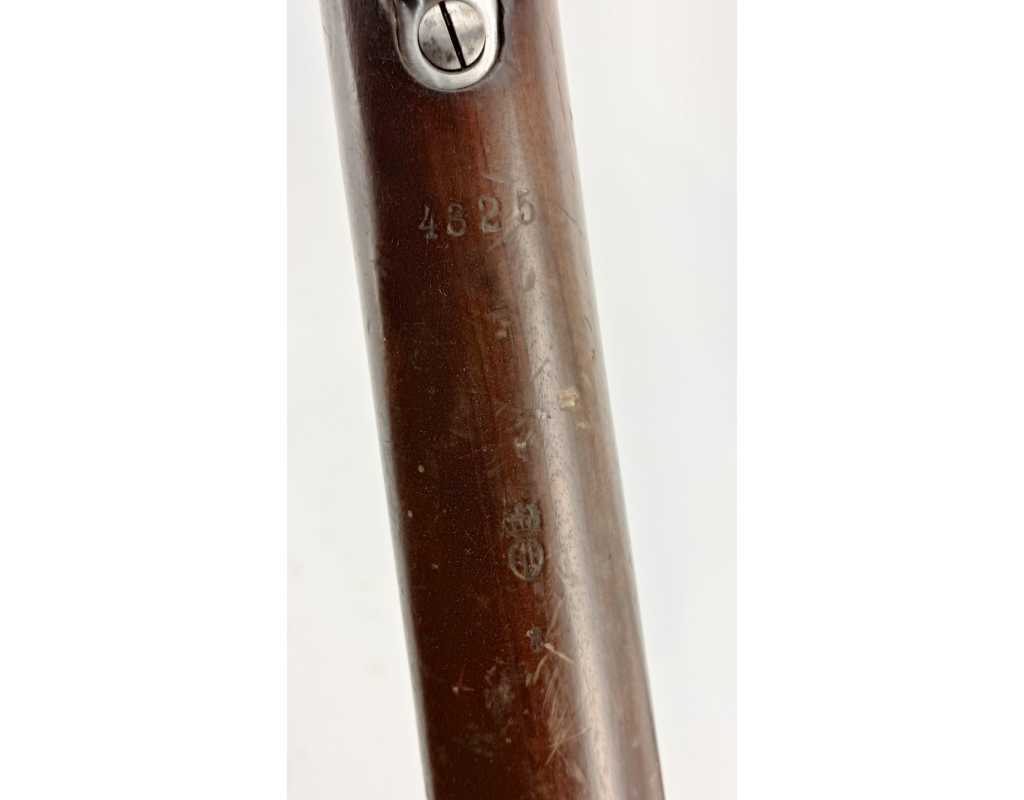 Fusil Mauser Gewehr G 98 Amberg 1916, calibre d'origine 8x57JS par le banc d'épreuve de St Étienne, capacité 5 coups à répétition manuelle. Arme avec toutes pièces d'origine au même numéro excepté la culasse. Bronzage patiné et légèrement taché, marquages de réception et poinçons de conformité sur chaque pièces non atténués. Canon de 750mm à rayures d'aspect satinées sans usure prononcées, fines taches en creux. Crosse et garde main en noyer avec poinçons bien visibles, craquelure du noyer au centre de la crosse côté droit sans fragilité et traces d'usage de manipulation.