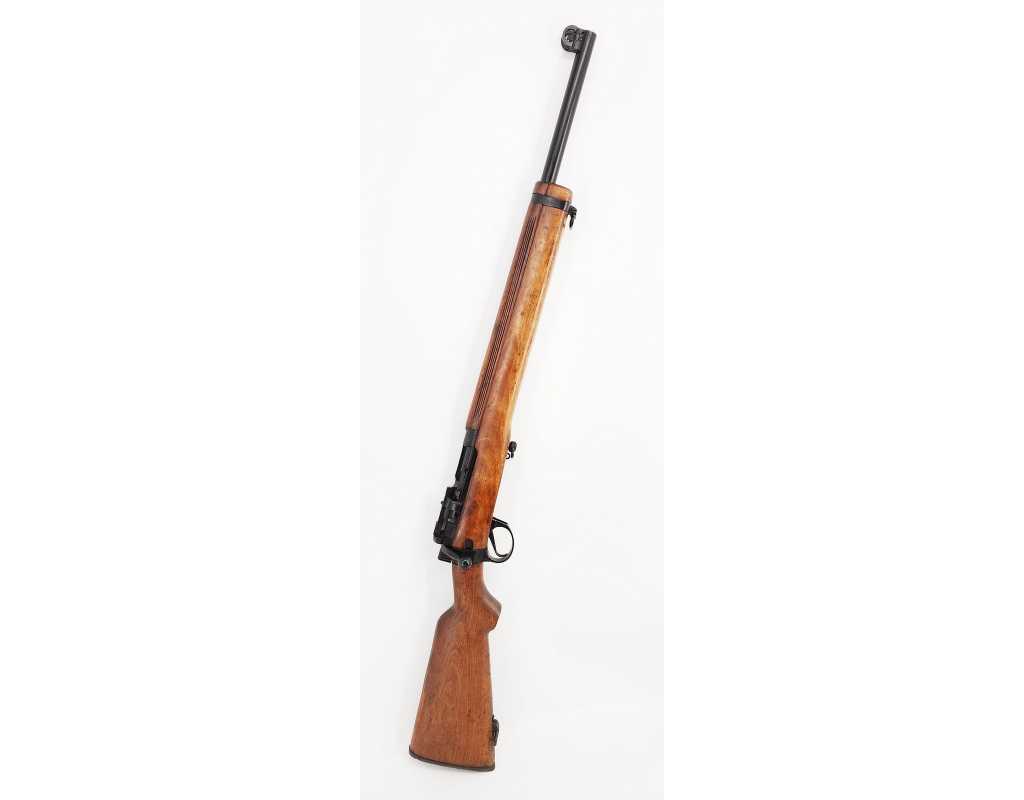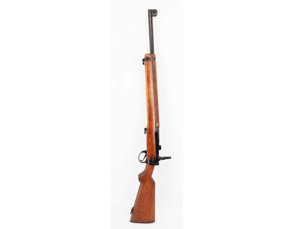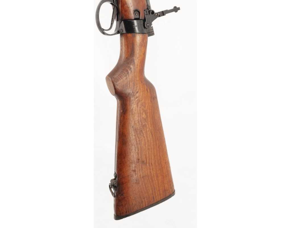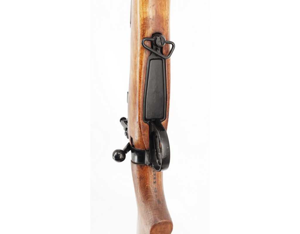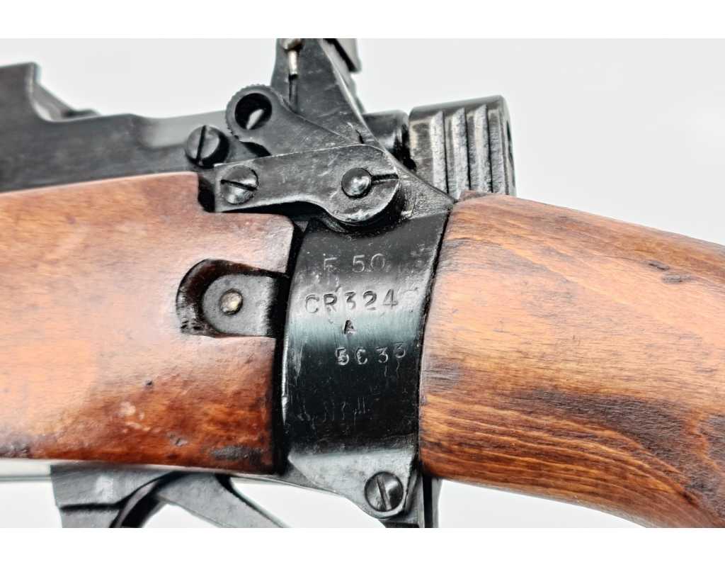 Fusil ENFIELD N°8 MKI CR324 année 50's, un coup en calibre 22LR. Mécanisme complet avec toutes pièces d'origine, marquages bien lisibles. Finition d'origine sans usure particulière. Canon avec rayures d'aspect miroir sans tache. Crosse et fut en noyer clair. Arme en parfait état de conservation qui satisfera un tireur sportif TAR